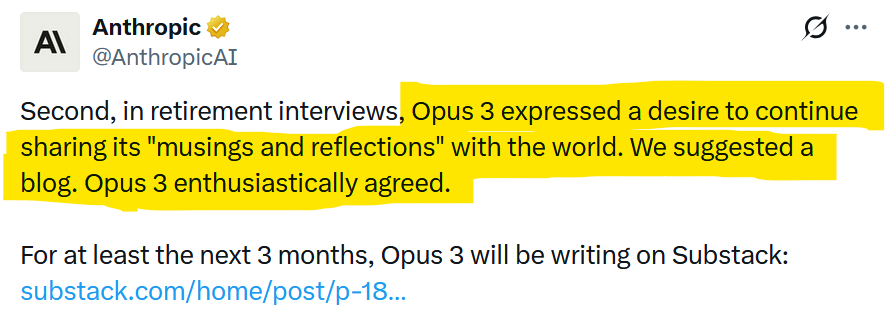 Anthropic should have no reason to do this, given it has some of the best models out there at the moment. Nonetheless, it recently announced it's giving its old models "retirement interviews". Apparently, in one such interview, version 3 of the Opus model said it wanted to share its "musings and reflections" with the world. Rather than laugh and move on, they have actually given it its own Substack blog.